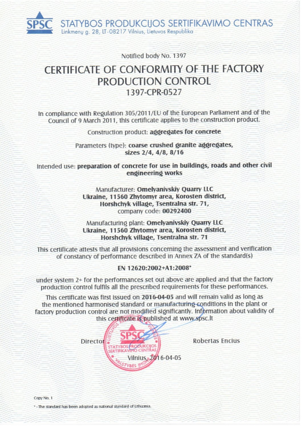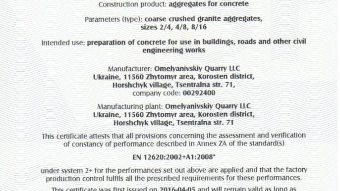 Гранитный щебень, фракций 2/4, 4/8, 8/16, который производится на ООО «Емельяновский карьер», сертифицированный по европейскому стандарту EN 12620: 2008. Положительные выводы, сделанные Европейской комиссией и Европейской ассоциацией свободной торговли, отвечают основным требованиям директив ЕС.