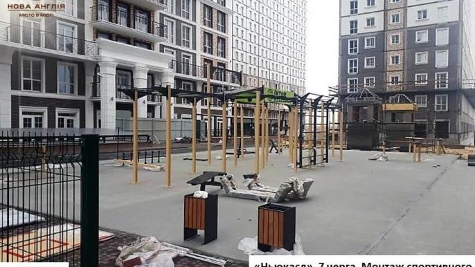- У будинку «Ньюкасл» (А-7) активно проводяться роботи з благоустрою території, адже зовсім скоро ми подамо документи на отримання сертифіката про введення в експлуатацію. За планом у дворі будинку «Ньюкасл» буде розташована спортивна зона з універсальним спортивним майданчиком, вуличні тренажери та простор для відпочинку або зайнять з йоги. Проводяться роботи з влаштування колон вхідної групи, наразі готовність колон на завершальній стадії. Завершено монтаж дверей комерційних приміщень у 1-й та 2-й секціях, у 3-й секції роботи виконані на 90%. Також завершується оздоблення фасадів будинку, виконання складає 90%.