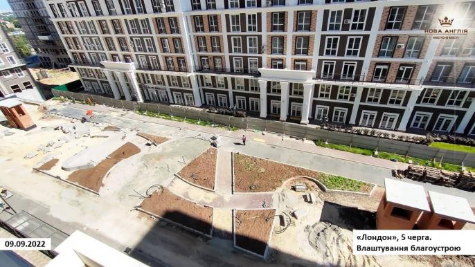 - У будинку «Лондон» (А-5) з кожним днем все більше вимальовується двір, яким прогулюватимуться резиденти. Також на 80% завершено ремонтні роботи в лоббі. На торці 3-ї тривають фасадні роботи.