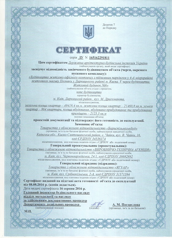 Также сообщаем, что полученный сертификат свидетельствует об окончании строительства в мкрн. Позняки, 4-А. Все 6 домов жилого комплекса введены в эксплуатацию. Желаем счастья новоселам!