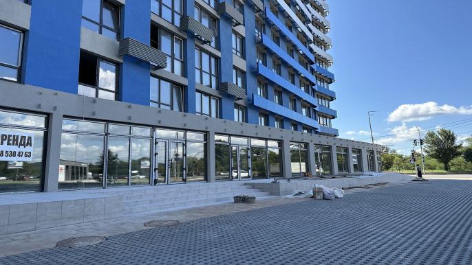 - Наразі майстри завершують фасадні роботи першого поверху (комерційні приміщення). Зі сторони вулиці Здолбунівської і Дніпровської набережної виконаний благоустрій території, триває облаштування території всередині двору: монтується вуличне освітлення, лавочки, озеленення.