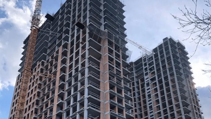 БУДИНОК № 2 - Демонтаж опалубки плити перекриття 24 поверх. Цегляна кладка стін і перегородок 18 поверх. Фарбування металевих куточків під вентблоки.
