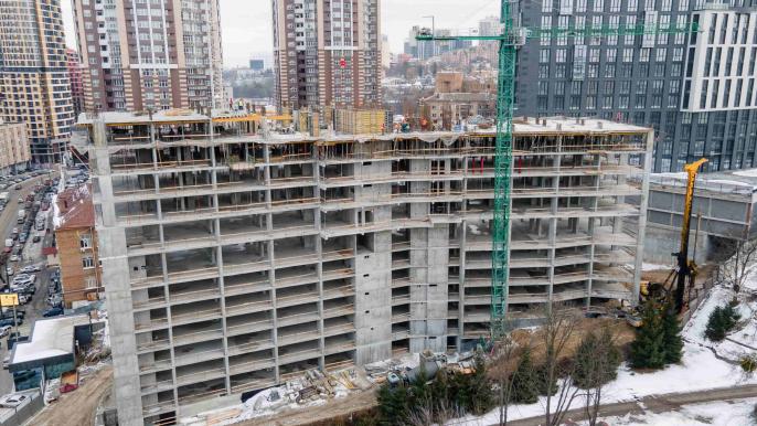 - Виконані роботи по армуванню та бетонуванню монолітних стін та пілонів 4 поверху, виконуються роботи по влаштуванню стін та пілонів 5 поверху.