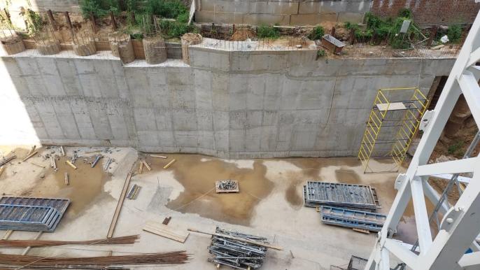 - Паркинг - Завершено бетонирование ростверка. Проходит устройство деревянной забора – готовность 25%. Завершено бетонирование подготовки рабочего шва и отсека 5 рабочего шва. Завершена разработка котлована и грунта ростверка.