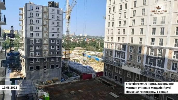 - У «Ноттінгемі» (Б-6) в 1-й секції завершено монтаж 10-го поверху стінових модулів Royal House. У 2-й секції будинку тривають роботи з армування і бетонування стін та перекриття -1-го поверху.