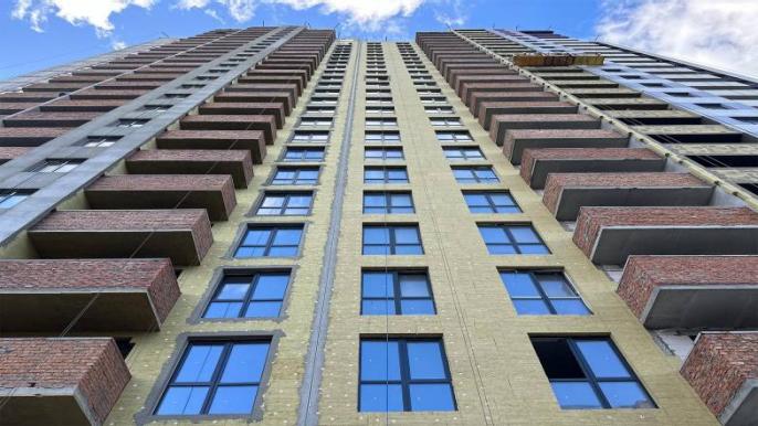 - В першому будинку третьої черги продовжуються фасадні роботи: утеплення стін мінватою й оздоблення.