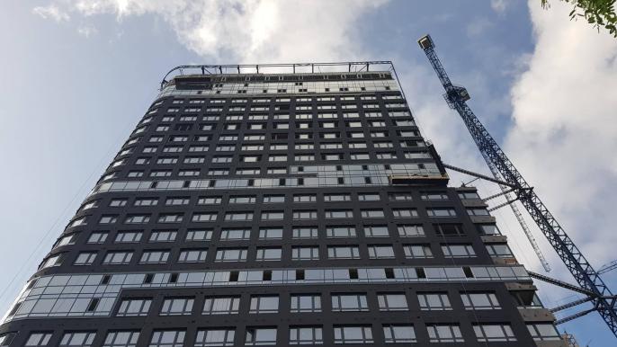- Секція 101 - Оздоблення холодних переходів та тамбурів до 23-го поверху виконали на 70 %; Продовжуємо облаштування мереж (встановлюються лічильники тепла, водопостачання - 70%); Виконали монтаж ліфтів ЖК (без пусконалагоджуваних робіт) на 100%; Облицювання ліфтових порталів плиткою виконуємо на 20 поверхах; Закінчили монтаж ламелей та установку світильників на 18 поверхах; Продовжуються роботи по влаштуванню мокрого фасаду будівлі, на зараз виконано 72%; Приступили до монтажу декоративних панелей «білі лінії» зі сторони пер. Ужгородського; Приступили до виконання опоряджувальних робіт вхідної групи.