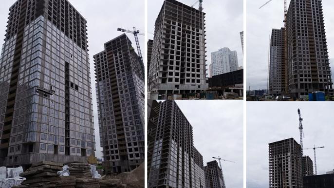 В доме №3 выполняют монтаж — выполнено 11 этажей. Устройство кладки проходит на 25-26 этажах.