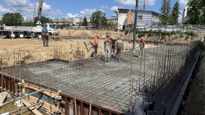 Залит фундамент под паркингом и коммерческими помещениями. Также в паркинге продолжается «вязка» вертикальных несущих элементов, заармировано ядро жесткости, выполняется гидроизоляция подземной части здания.