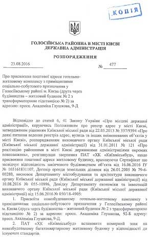 ПАО «ХК «Киевгорстрой» информирует, что решением Голосеевской районногй в городе Киеве администрации от 23.08.2016 года почтовый адрес присвоено ІІ очереди строительства гостинично-жилого комплекса с помещениями социально-бытового назначения по просп. Академика Глушкова, 92-Б
