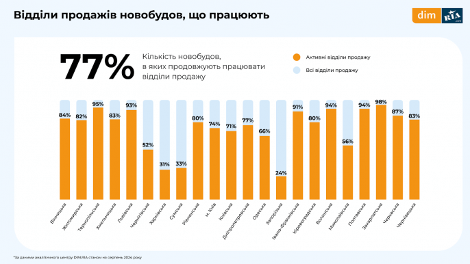Станом на серпень 2024 року, у Києві активно працюють 71% відділів продажів новобудов, згідно з даними аналітичного центру DIM.RIA. Хоча це не найвищий показник серед регіонів, столиця зберігає відносну стабільність у роботі ринку нерухомості, попри складні економічні та безпекові умови.