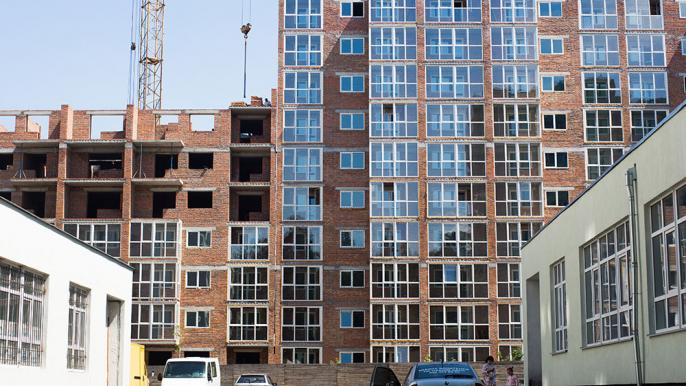 - 1, 2 секции - построен 7-й этаж, застеклили 2-4 этажи.
