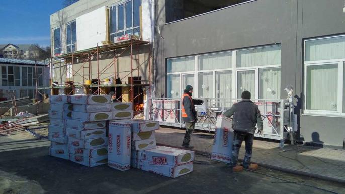 - Выполняются работы по утеплению и армированию фасада (мин. вата)