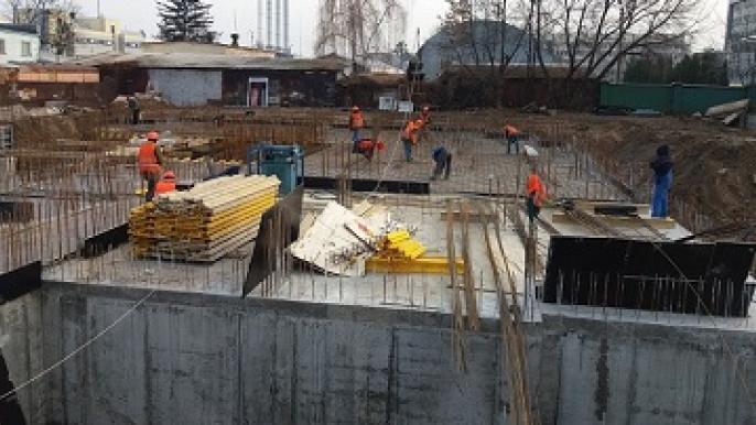 На площадке дома №2 продолжаются работы по устройству промежуточной плиты перекрытия цокольного этажа.