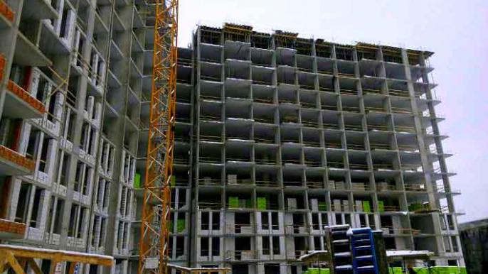 В доме №2: секция «Г» - Устройство плиты перекрытия над 2 этажом.- Устройство гидроизоляции цоколя — 25%. Секция «Д» - Устройство вертикальных элементов 3 этажа. - Устройство гидроизоляции цоколя — 25%.