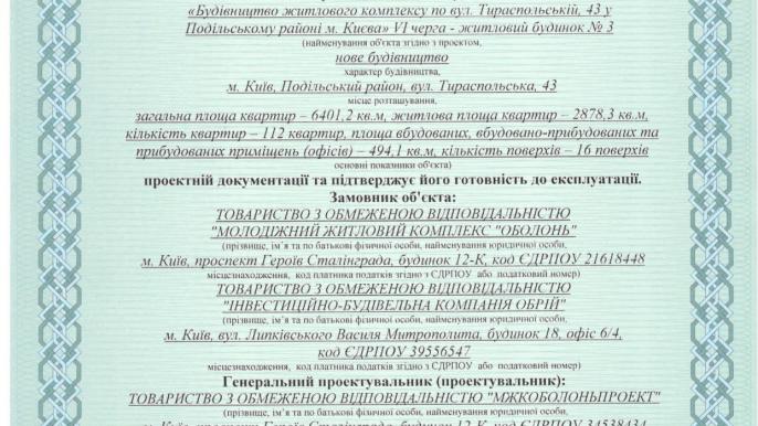 Государственная архитектурно-строительная инспекция Украины (ГАСИ) выдала сертификаты соответствия на жилые дома №3, №4, 4а и №5 по (строительному) адресу ул. Тираспольская, 43.