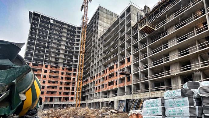 - 3 та 4 секції: Повністю завершено роботи з бетонування плити перекриття 8-го поверху.