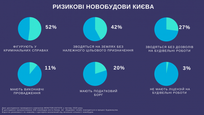- возведение на землях без соответствующего целевого назначения или без сформированной земельного участка – 174 (42%) новостройки в Киеве,