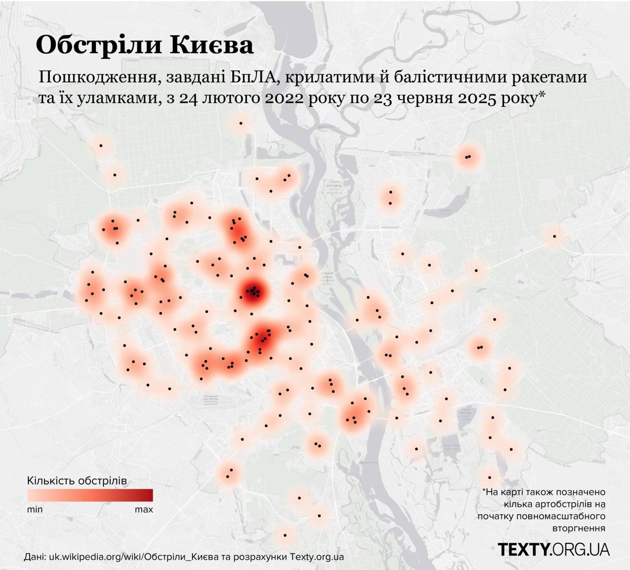 Составлена карта ударов по Киеву за последние три года и выяснили, что чаще всего под обстрел попадают Шевченковский, Святошинский, Соломенский и Голосеевский районы.