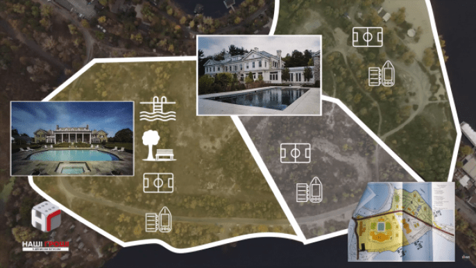 В соответствии с проектом, поданным в КГГА, территорию разделили на три части. На одном из участков планируют построить особняк с открытым бассейном, лужайкой, хозяйственными и спортивными зданиями, а также с собственной причальной зоной. Второй участок предназначен также для спортивных и административных зданий, и имеет собственный выход к воде. Рядом запланировано строительство базы отдыха со спортивными площадками и причалом.