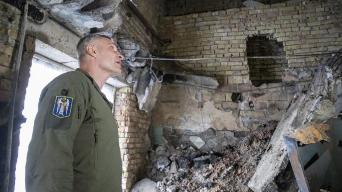 Мер Києва Віталій Кличко оглянув в Оболонському районі столиці житловий будинок, пошкоджений внаслідок ворожої атаки в ніч на 4 травня.