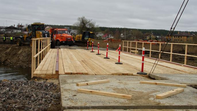 Станом на 13.04.2022 влаштовано мостове полотно та дорожній настил з дошок, встановлені колесовідбійники, перильне огородження. Для безпеки міст обладнано стійками для розділення смуг руху. Військові мостобудівельники проводять завершальні роботи. Працівниками Укравтодор будуються під’їзні шляхи.