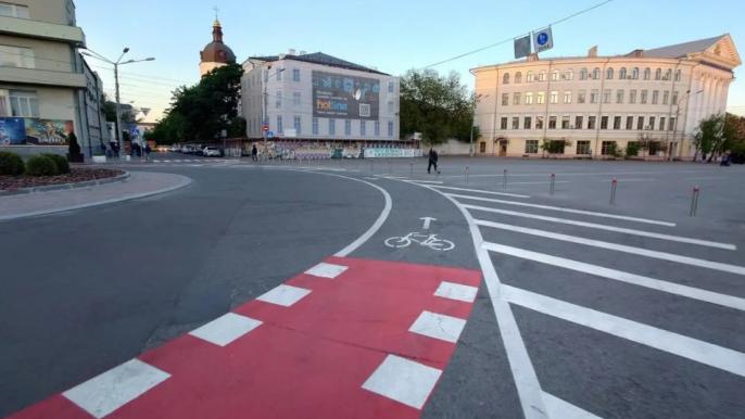 На перехресті вулиць Межигірська і Григорія Сковороди та Контрактової площі змінили організацію дорожнього руху та облаштували велосипедні смуги.
