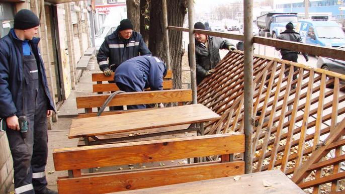 Работники КП “Киевблагоустройство” демонтировали летнюю площадку заведения общественного питания на ул. Новоконстантиновской, 22.