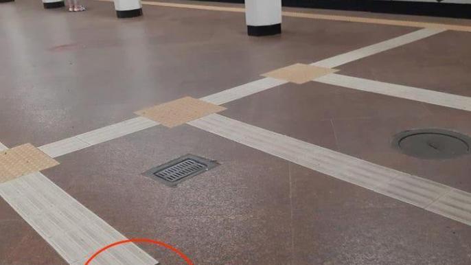 На фото видно, что на платформе станции с пола отвалилась плитка.