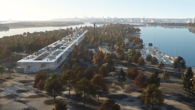 Архитекторы предложили разместить на полуострове вытянутое здание в форме параллелепипеда длиной около 700 метров и шириной 39 метров.