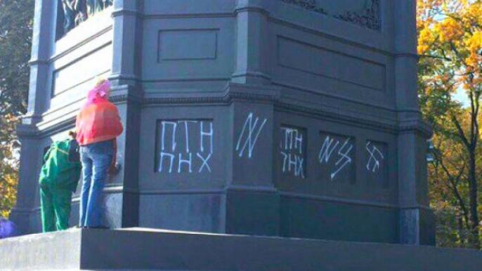 Вандалы нарисовали свастику и оставили надписи "ПТН ПНХ". На месте работает полиция. Памятник отмывают коммунальщики.