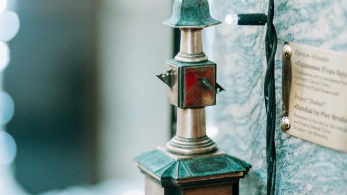 «Если вы зайдете во двор Киево-Могилянской академии со стороны улицы Григория Сковороды, то увидите на зеленом газоне странное, на наш современный взгляд, сооружение: белую колонну с зеленой крышей от дождя, а посередине колонны – встроенный в нее куб со странным разметкой и жестяными треугольниками. В любой дневной час от этих треугольников ложатся на разметку тени – так работают эти солнечные часы, самый старый из сохранившихся в Киеве учебных пособий по математике», – рассказала она.