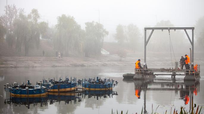 12 гейзерных фонтанов понтонного типа весом около 6 тонн демонтировали из акватории Русановского канала.