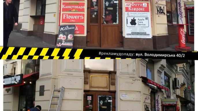 В Киеве на доме по ул. Владимирской, 40/2 демонтировали рекламные вывески.