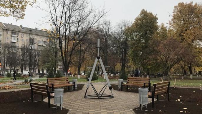 В сквере установили лавочки, урны для мусора, а изюминкой стала тематическая инсталляция в виде огромного циркуля.