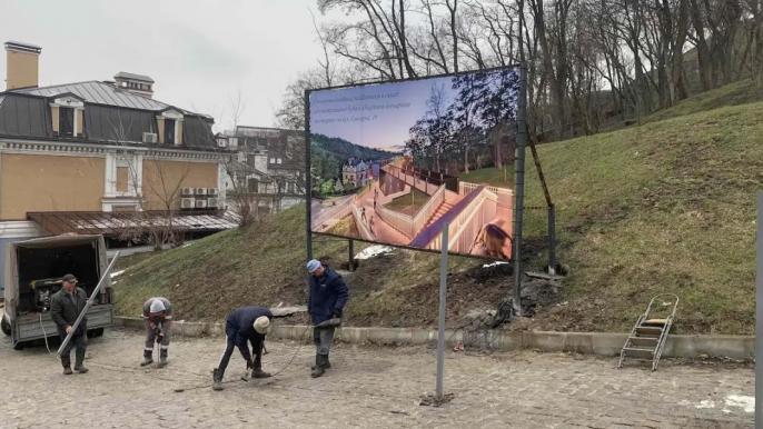 На вулиці Гончарній, біля сходів на Старокиївську гору з Воздвиженки, розпочалися будівельні роботи.