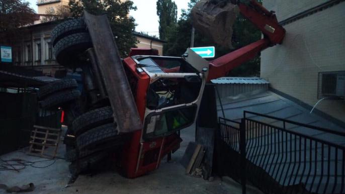 В Киеве на ул. Круглоуниверситетской, 7 на жилой дом упал строительный экскаватор.