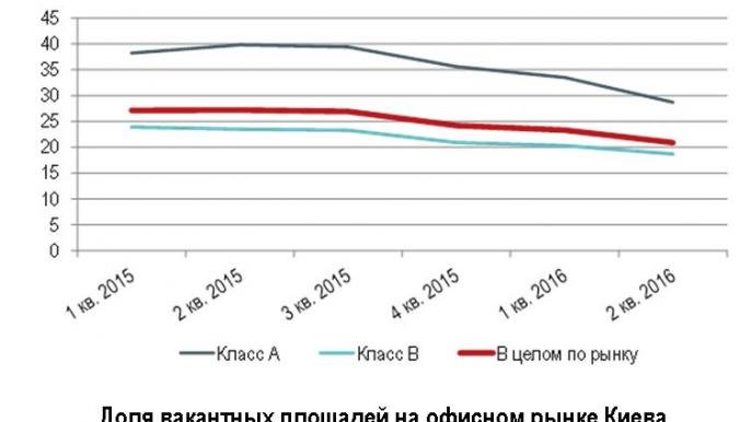 Доля свободных помещений на рынке качественных офисных центров Киева по итогам 2-го квартала 2016 года составила 20,9%, снизившись на 2,4 п.п. за квартал и на 6,3 п.п. в годовом сопоставлении. Сокращение показателя наблюдалось и в классе А (на 4,8 п.п. за квартал, 11,1 п.п. за год), и в классе В (на 1,6 п.п. и 4,8 п.п. соответственно).