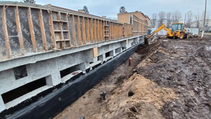 Будівництво розпочалося восени 2023 року. Спочатку підрядник провів підготовчі роботи: розчистив територію, облаштував котлован. Наразі вже виконано 85% монолітних робіт. Тривають роботи з гідроізоляції та облаштування підлоги.