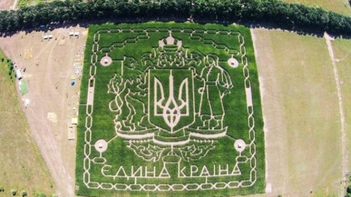 Лабиринт вырезан в кукурузном поле. Ходы лабиринта проложены в виде национального герба – трезубца и надписи "Единая страна".