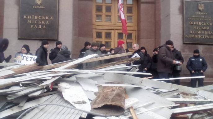 Под стены мэрии активисты принесли обломки МАФов, а также шины, передает СтройОбзор.