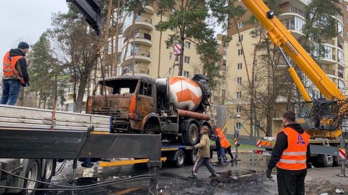 На фотографіях — дорожники прибирають обпалену будівельну техніку. До війни її використовували для розбудови нашої країни, зараз же — це чергове свідчення російських злочинів.