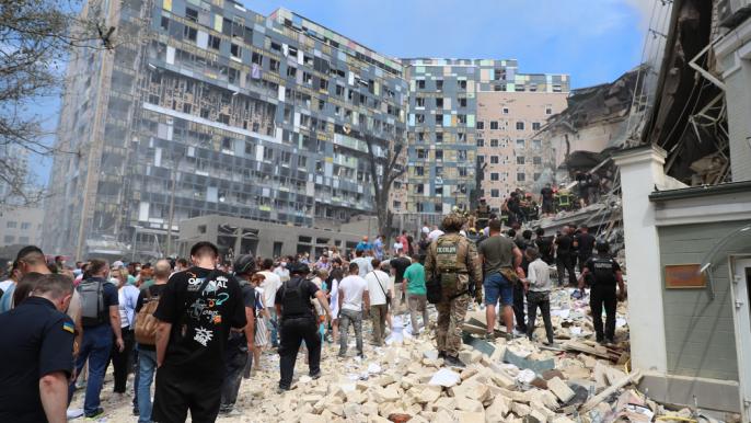 У житловому будинку на Сирці, у Шевченківському районі столиці, повністю зруйнований один підʼїзд, кілька – сильно пошкоджені. Зруйновані близько 17 квартир. З-під завалів рятувальники намагаються дістати людей.
