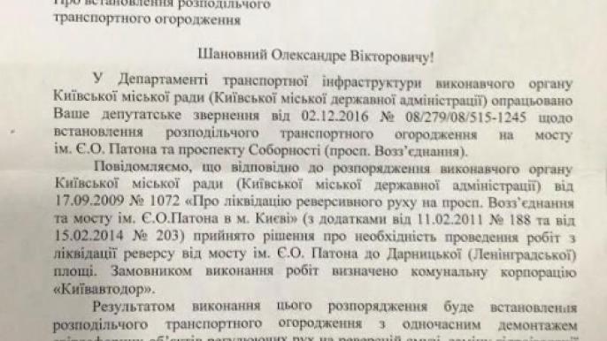 "Департамент транспортной инфраструктуры инициирует установку распределительного транспортного ограждения и демонтаж светофорных объектов, регулирующих движение на реверсной полосе, замену гидроизоляции на мосту с последующим ремонтом асфальтного покрытия до Дарницкой площади. Гарантированно вырастет балльность пробок. Гарантированно улучшится статистика ДТП на участке", – сообщал он.