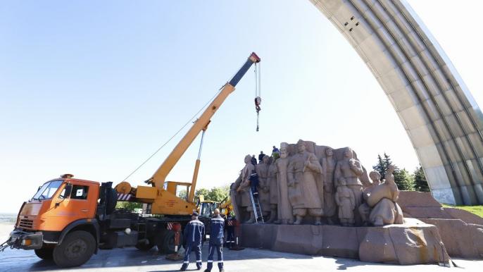 «На території Хрещатого парку Арка дружби народів складалася з самої арки та двох скульптурних груп під нею. Цю композицію перейменували на Арку Свободи українського народу, а у квітні 2022 року демонтували монумент, присвячений «об’єднанню України з росією». Це була композиція робітників – росіянина й українця, які спільно підняли стрічку з орденом «Дружби народів». Сьогодні з центру композиції розпочали демонтаж ще однієї скульптурної групи, створеної за мотивами Переяславської ради, коли було підписано договір про об’єднання України з росією», – розповів він.