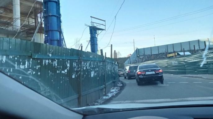 В частности, на проезжей части установлен забор, сразу же за которым ведется строительство.