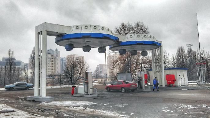 Це була одна з двох «футуристичних» АЗС, які звели у столиці наприкінці 1970-х — за адресами Броварський проспект, 53, та Харківське шосе, 68, передаэ СтройОбзор із посиланням на Хмарочос.