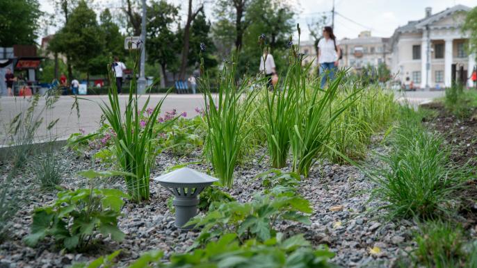 У столиці облаштовують унікальні ландшафтні рішення для збирання та подальшої утилізації води, що мають вигляд квіткової клумби.