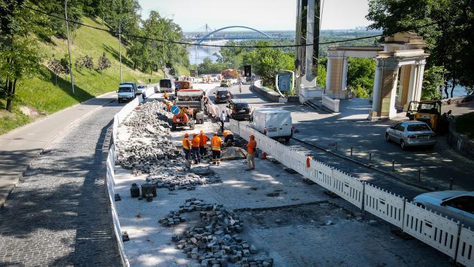 У Києві розпочали етап ремонту Володимирського узвозу: масштабні ремонтні роботи покриття із бруківки на середніх смугах дороги.