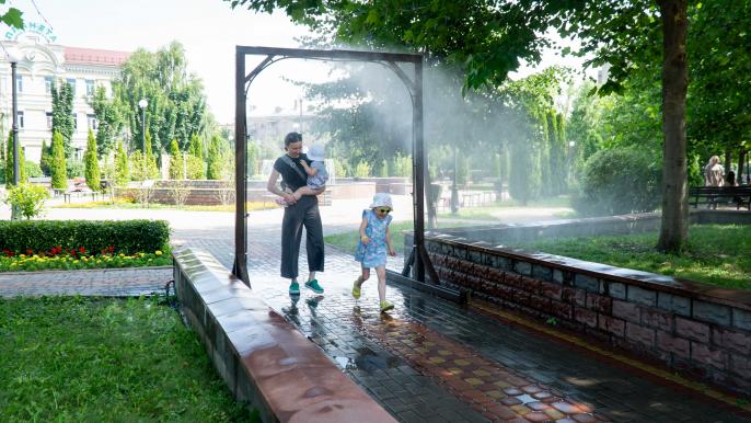 У столичних парках, скверах і на центральних вулицях міста встановлюють рамки-розпилювачі води для охолодження в літню спеку.